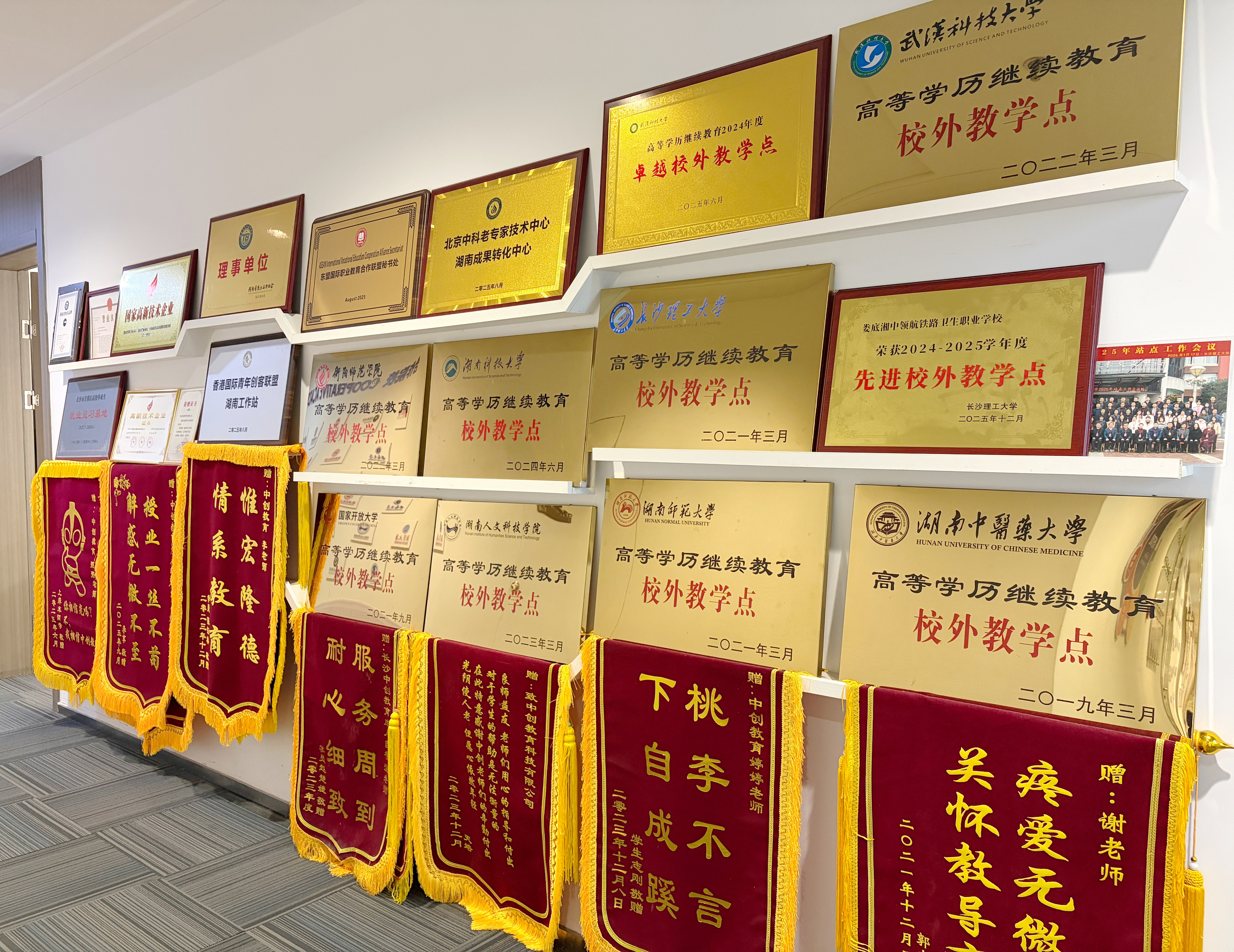 中创教育是湖南本土的老牌机构,2006年开始和高校合作,2014年正式公司化运营,到现在19年。总部在长沙世茂环球金融中心42楼,整层2500多平。他们是湖南师范大学、湘潭大学、长沙理工大学、湖南科技大学、湖南农业大学等多所高校的官方备案助学点,授权牌就挂在前台。服务模式是给每个学员配专属班主任,从报名到毕业全程跟进。考前那几天,老师早上六点就起来发消息提醒带准考证;成考考试时候,很多学生不知道准考证要提前下载,他们一个个下载好私信发过去。